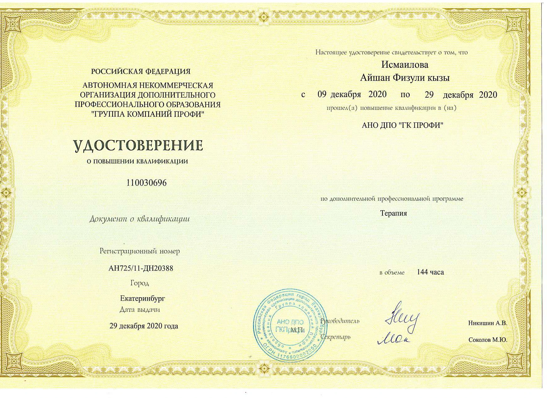 - 2020 — АНО ДПО «Группа компаний ПРОФИ». Повышение квалификации и получение сертификата специалиста по терапии/